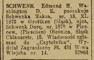 4. Powojenne gazety pełne były ogłoszeń dot. poszukiwania zaginionych członków rodziny. Ten dot. Maxa i Dorothei/Dory Schwenk pojawił się w nr 100 "Dziennika Zachodniego" w 1946 roku |