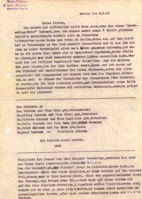 9. Fragment listu Kathariny Pritzkow do członków rodziny Schwenk, którzy przetrwali Holokaust. W liście wymienione są nazwiska członków rodziny,