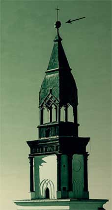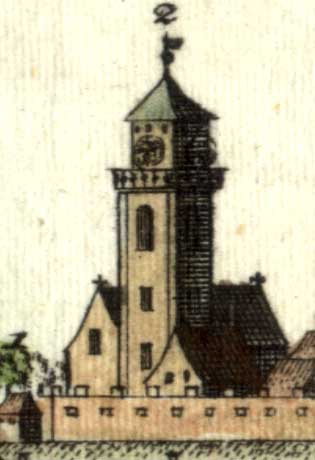 Gotycki hełm wieży kościoła NMP. Rys. F.B. Werner. Z kolekcji Marka Górnickiego. Widać, że już wtedy instalowano galki, do której coś wkładano ku pamięci |