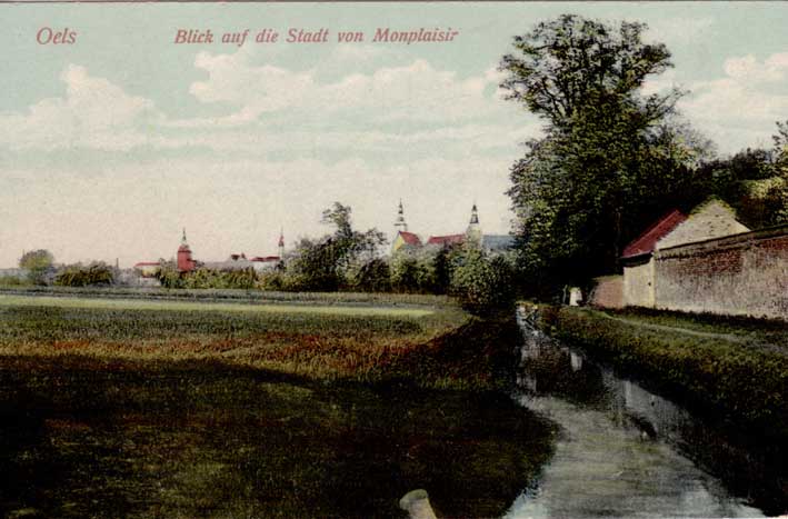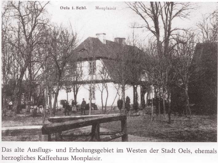 Na widokówce widać budynek (grupę budynków, teren) określany jako Monplaisir (Moja przyjemność). Podpis pod nim jest następujący - Das alte Ausflugs- und Erholungsgebiet im Western der Stad Oels, ehemals herzogliches Kaffeehaus Monplaisir. Czyli - stary teren wycieczkowo-rekreacyjny w zachodniej części miasta Oels, dawniej książęca kawiarnia Monplaisir.
