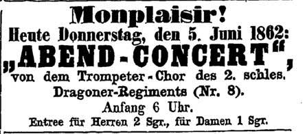 Przykładowe ogłoszenia z gazety oleśnickiej Lokomotive ad der Oder o koncertach urządzanych w Monplaisir.