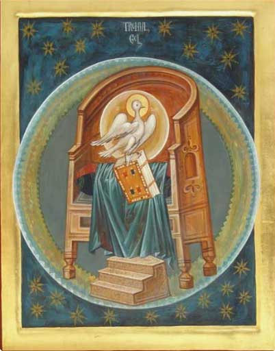 Św. Jana piszący ewangelię, nad nim siedzi orzeł z nimbem, trzymający księgę