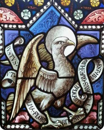 Biały orzeł św. Jana trzyma białą wstęgę ze strofami ewangelii.