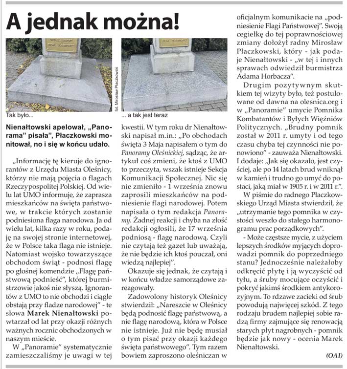 Do tego tekstu dodam tylko, że od 2010 r. piszę o błędach historycznych i edytorskich na tablicach informacyjnych Urzędu Miasta Oleśnicy rozmieszczonych na byłym kościele NMP i na Ratuszu oraz od 2004 r. o głupawych herbach Oleśnicy i używanej (od 2009 r.) na oleśnickim maszcie ratuszowym fladze Bielska-Białej, a od 2019 r. piszę o nowych rysunkach herbów przyjętych uchwałą przez Komisję Heraldyczną MSWiA i nie zatwierdzonych przez radnych oleśnickich z powodów pozamerytorycznych.