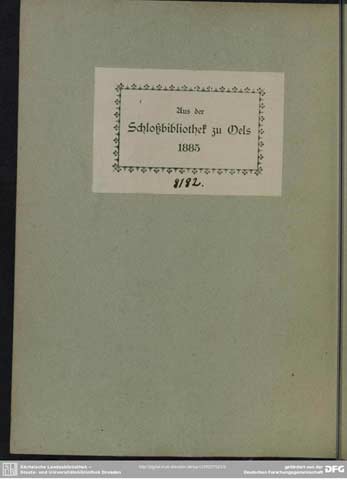 Tam podczas przyjmowania na stan, przybito na stronie tytułowej, z jej lewej strony, pieczątkę o treści E. BIBL. OLSN z datą 1885. W środku znajduje się herb Wettynów. Czyli pieczątka wskazuje, że pochodzi z książęcej biblioteki oleśnickiej. Z prawej przybito pieczęć Królewskiej Bibliotece Publicznej w Dreźnie, z tym samym herbem.