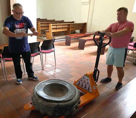 Wyładunek podstawy chrzcielnicy z samochodu. Z lewej Piotr Michalak. Fot. Grzegprz Michalak