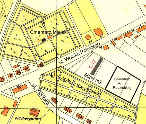 Na cmentarzu ewangelickim pochowano 1. osobę (czarny prostokąt oznaczony - 1)