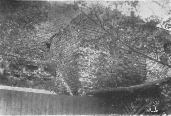 Stare zdjęcie czatowni - widać różnice w wysokości murów miejskich (przed ich renowacją) i mur budynku stojącego za murem |