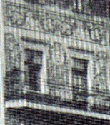 Po powiększeniu widokówki pojawiają się na ścianie frontowej pierwszego z budynków widoczne dekoracje w postaci malowideł, a może sgraffito.