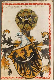 Niżej herb z pięcioma klejnotami, używany w szczególnych przypadkach. Jest na nim też klejnot w postaci "żagla". |