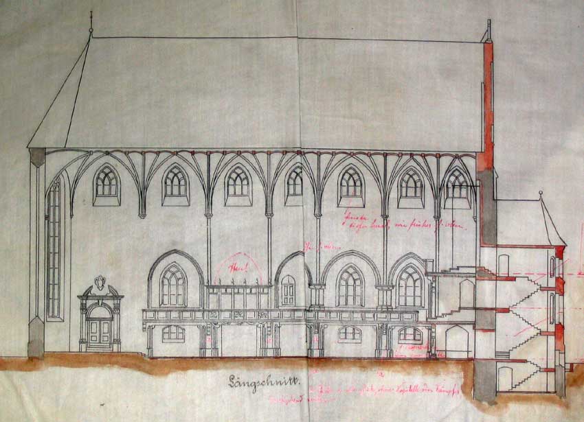 Przekrój kościoła, data 23 luty 1903 r. podpis Poelzig. Kolorem bordowym pokazano nowe rozwiązania w stosunku do wówczas istniejących.