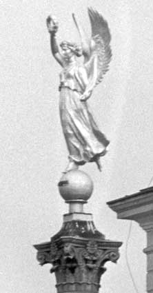 Figura Nike po odlaniu i umieszczeniu na kolumnie. Proste w swych formach i pozbawione dekoracji dzieło Ludecke i Wittiga pozostało - także w proporcjach - zestrojone ze stanowiącą jego tło neoklasycystyczną fasadą ratusza [2]. Fot. E. Niczypor |
