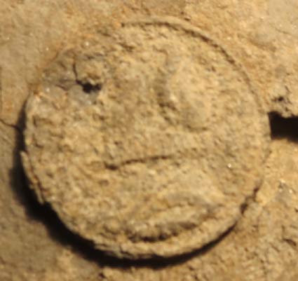 "Kawałek" blachy z przymocowanym medalem, przedstawiającym popiersie kobiety w krynolinie. Zdjęcie medalu powiększono w stosunku do średnicy medalu Karola II |
