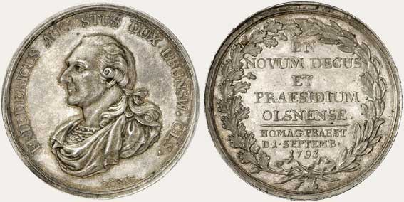 Medal wybity z okazji ślubu córki ostatniego księcia wirtemberskiego z linii oleśnickiej - Fryderyki Zofii Charlotty Augusty (ur. 1751 r.) i Fryderyka Augusta, Welfa z linii brunszwicko-lüneburskiej (ur. 1740 r.). Napisano na nim: W górze - Fortes sic junguntur fortibus. Niżej - In memoriam diei festi celebrati 1768 d.6. Sept. IGH Johann Gottlieb Held z Wrocławia, średnica 43,5 mm; waga 28,5 g.[Fritz Rudolf Künker GmbH & Co. KG, Osnabrück; Lübke & Wiedemann KG, Leonberg]