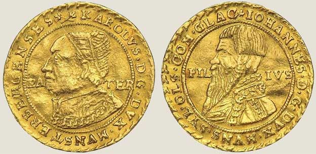 Guldeny księcia Karola I (uwaga, większość ilustracji złotych monet pochodzi z www.kuenker. de)