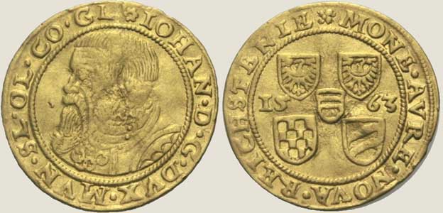 Wybito trzy odmiany różniące się głównie rozmieszczeniem tarcz herbowych z herbu księstwa ziębicko-oleśnickiego. Śr. 24 mm, złoto, waga 3,3 g. Awers - postać św. Jakuba. W jego nogach tarcza herbowa Podiebradów. Awers: ALBE: KARLO: D: G: D: MUNS. Rewers: MONETA NOVA AUR(E) REICHSTI.[Fritz Rudolf Künker GmbH & Co. KG, Osnabrück; Lübke & Wiedemann KG, Leonberg]