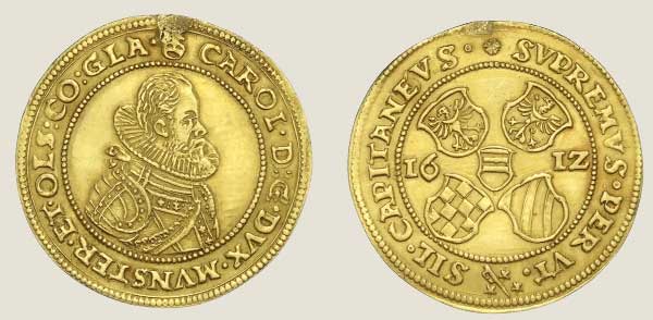 Gulden. od 1510 do 1520 (21?). Śr. 24 mm, złoto, 3,3 g. Awers - postać św. Jakuba. W jego nogach tarcza herbowa Podiebradów. Awers: KAROLUS D: G: D: 1515 Rewers: MONETA NOVA AUR(E) REICHSTI. Rozłożony herb księstwa ziębicko-oleśnickiego. Do 1519 r. inicjały mincerza H-D - Hans Dippold (1510 - 1520).