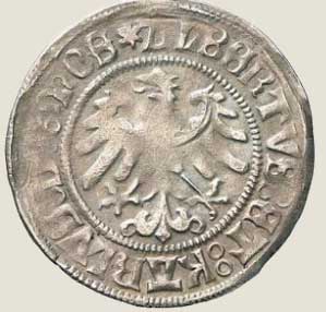 Grosz - wybijano je w 1517-1519 r. Pokazany powyżej wybito w 1518 roku. Srebro.