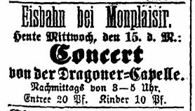Tor lodowy przy Monplaisir Niedziela, 7 stycznia 1884 r. po południu od 15:00 do 18:00: Koncert walców w wykonaniu orkiestry Jegrów. Wstęp dla dorosłych 20 fen., dzieci 10 fen. |
