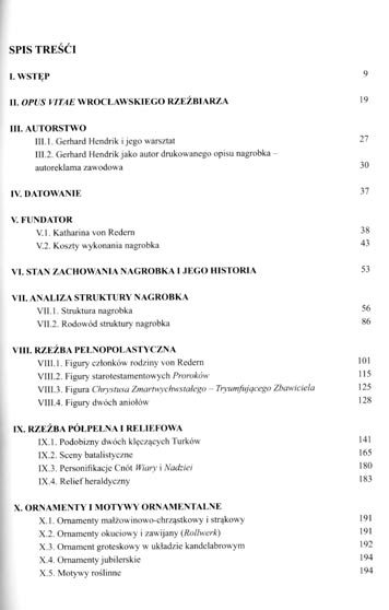Książka na 324 stronach zawiera treść i liczne ilustracje zgrupowane w 18. rozdziałach, których tytuły załączam [1], [2]. Tak jak w poprzednich książkach - P. Oszczanowski opisuje dokładnie każdy element pomnika i porównuje z podobnymi pomnikami innych rzeźbiarzy i innymi realizacjami G. Hendrika. Również sięga do ambony i pomników oleśnickich, co jest cenną promocją naszych zabytków. W końcowej części książki zamieszczono 61 dużych kolorowych zdjęć poszczególnych elementów, pokazujących piękno nagrobka i klasę jego wykonawcy. Cztery z nich pokazałem wyżej.