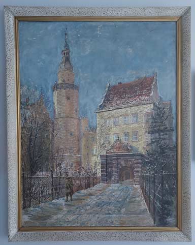 Niżej obraz przedstawiający zamek z okresu ok. 1891-1905 r. Jego wymiary z ramą to 86 x 110 cm. Brak jakichkolwiek sygnatur. Widać, że często zmieniał miejsca ekspozycji, gdyż ma ślady napraw.