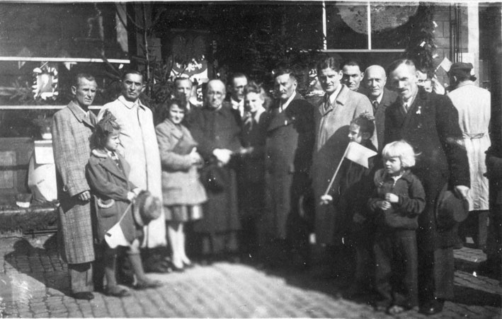 Spółdzielcy i może rzemieślnicy świętowali Dzień Spółdzielczości 1.09.1945 r. W środku chyba stoi ks. Antoni Rzeczuch.