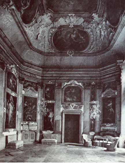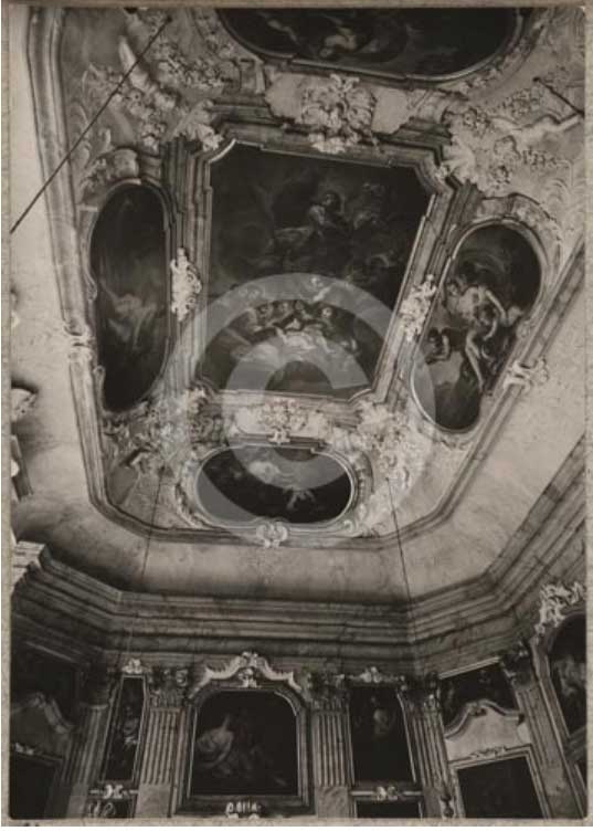 Plafon po usunięciu pięciu obrazów (ok. 1960 r.). Na środku był podwieszony obraz Alegoria Muzyki