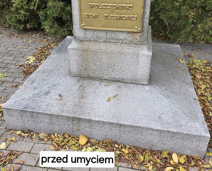 Brudny pomnik został w 2011 r. umyty i od tego czasu chyba tej czynności nie ponowiono. Wielokrotnie o tym pisałem i nikogo to nie obchodziło. Okazało się, że radny Mirosław Płaczkowski, czytający moją stronę, też uznał, że jest to nienormalne. Udał się w tej sprawie do Burmistrza A. Horbacza i w rezultacie, po kilku dniach pomnik został umyty.