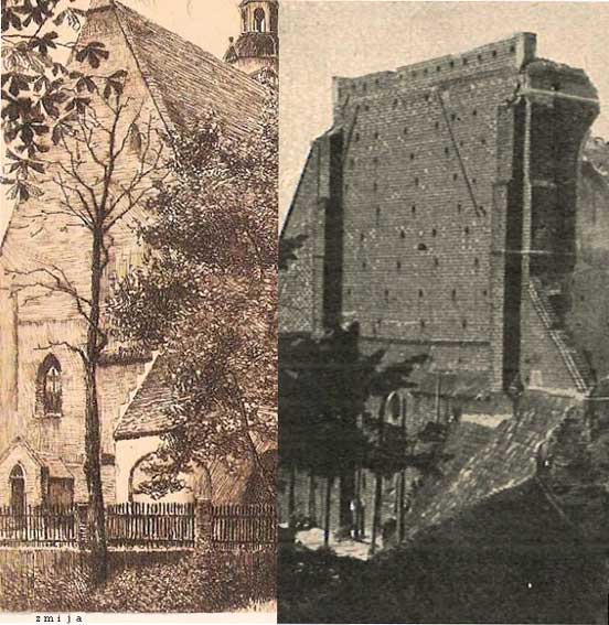 Z lewej rysunek Helmy Fischer sprzed 1905 r. Mała kruchta zachodnia i okno są przesunięte