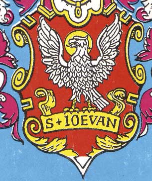 W polu czerwonym biały orzeł św. Jana Ewangelisty, głowa w złotym (żółtym) nimbie, skrzydła rozpostarte do lotu, stoi na białej wstędze z czarnym napisem S+IOEVAN.