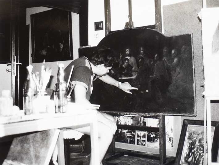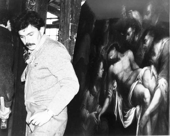 W. Piechówka przy restauracji obrazu "Ostatnia Wieczerza". Fot. Z. Podurgiel
