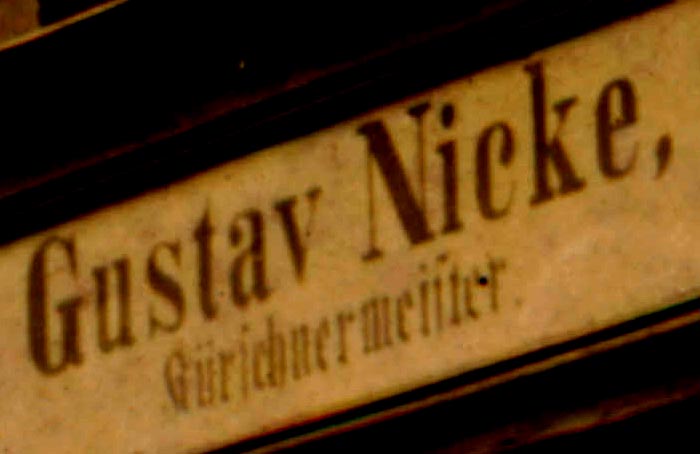 Nazwa firmy widnieje na szyldzie Konrada Krafta - był on szewcem. Z zawodem Gustawa Nicke było więcej problemów. Na powiększeniu widać zawód Gürschnermeister, którego nie ma w internecie (czyli nie istnieje). Jedyny znaleziony zawód, po kombinacjach z podstawianiem liter, to Kürschnermeister - kuśnierz. I taki wstępnie przyjęto. G. Nicke miał zapewne zakład w podwórzu. Szyldu nie posiadał jeszcze czapnik.