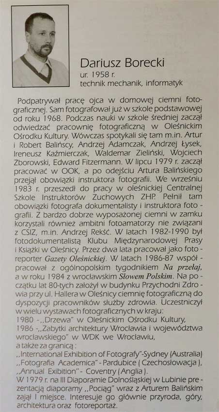 Poniższe skany zdjęć przekazała mi kilkanaście lat temu Danuta Obrębska-Kubik. Znalazła je po przejęciu pracowni w galerii Klubu Międzynarodowej Prasy i Książki. Zdjęcia prawdopodobnie wykonał Dariusz Borecki, który był dokumentalistą wydarzeń w tym klubie. Pan Dariusz miał pracownię fotograficzną w przychodni ZOZ i prawdopodobnie jego żona pracowała w szpitalu - stąd może dokumentacja zdjęć ze szpitala. Pani Danka nie zdążyła potwierdzić autorstwa, gdyż ich autor zmarł nagle w 2001 r. Dariusz Borecki był znanym fotografikiem i jego notka bibliograficzna znalazła się w książce: Światłem Malowane. Fotografia w Oleśnicy w latach 1945 - 2000, wydanej przez Powiatową i Miejską Bibliotekę Publiczną. Oleśnica 2000. Opracowanie Danuta Obrębska - Kubik, Edward Niczypor. (Notka bibliograficzna o autorze) |