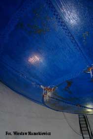 Po wejściu na strop wieży widać dno zbiornika, sposób połaczeń brytów blach przy pomocy nitów, okienka do oświetlenia pomieszczenia i drabinę do wejścia na poziom cylindrycznej części zbiornika. Posadzka stropu jest mokra od spadających kropel rosy. Krople te odrywając się od łebków nitów - żłobią w posadzce stropu pasy zagłębień odpowiadające pasom połączeń nitowych.