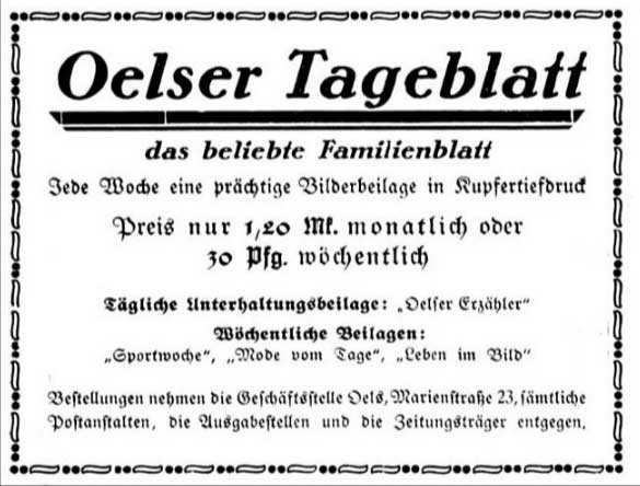 Oelser Wochenblatt - opis gazety, której winietę pokazano powyżej nie udało się jeszcze odnaleźć. Zaczęła ukazywać się w 1924 r. Wychodziła także gazeta Oelser Tageblatt oraz Volkszeitung, których przykładowych stron nie udało się jeszcze uzyskać.