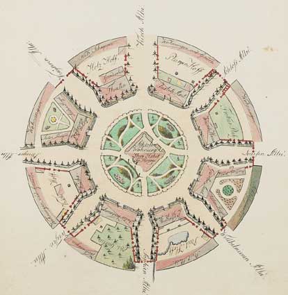 z puklami piór w trzech kolorach. W dali widoczny jest pałac w Pokoju, który w tej postaci istniał od 1779 r.