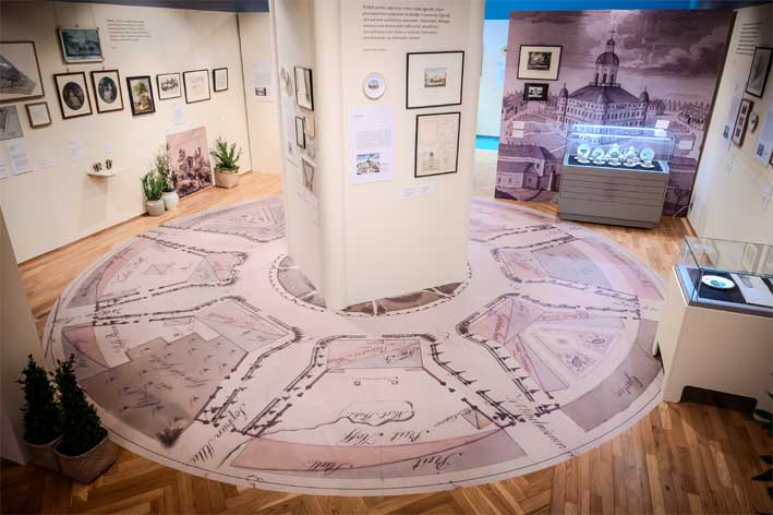 Pokazano salę z naniesionym na podłodze planem rozmieszczenia miejscowości Pokój. Na jego środku (na ilustracji pałacu książęcego) postawiono "słup", na 4-ch bokach którego powieszono liczne ilustracje pałacu, widocznego w głębi. Z prawej pokazano plan Pokoju, który widać na podłodze. Fot. M. Grocholski, MŚO |