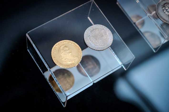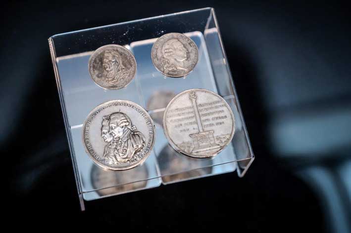 Z lewej niezwykle rzadka złota moneta Karola Chrystiana Erdmanna o wadze 11 dukatów, wybita stemplem talara w kilkunastu egzemplarzach