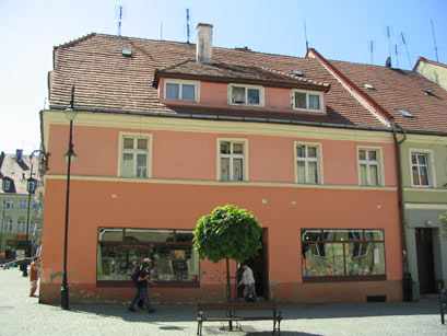 do charakteru zabudowy, choć - zapewne w XIX w. kamieniczka została podwyższona o jedno piętro. Wewnątrz interesująca drewniana zabiegowa klatka schodowa o cechach stylu cesarstwa (empire) z pocz. XIX w. - choć może to być jakaś późniejsza kontynuacja tej eleganckiej formy. Apteka w tym budynku pojawiła się w 1882 r. Nad wejściem do niej znajdowal się do 1945 r. symbol apteki - rzeźba lecącego orła. Zachowała się zabytkowa brama wejściowa, której jedno skrzydło zabrał niedawno stolarz-renowator niezadowolony z braku właściwej opłaty za wykonana pracę.