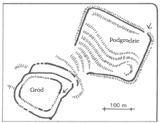 mógł wyglądać gród i podgrodzie oraz "umocnienia". Rysunki