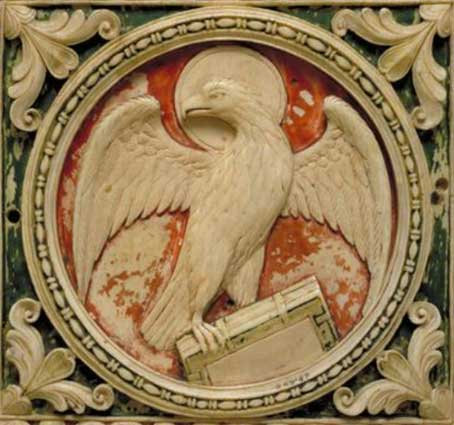 Biały orzeł św. Jana trzyma białą wstęgę ze strofami ewangelii.