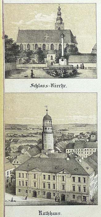 Kościół zamkowy także otoczony murem. Niżej Ratusz, jeszcze bez wewnętrznej klatki schodowej łączącej przedtem dwa oddzielne budynki, stąd trzy wejścia |