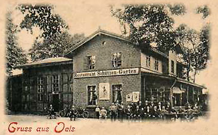 Zmiany w nazwach na widokówkach utrudniają rozpoznanie. Nie wiadomo, czy poniższe budynki Schützengarten to rozbudowane Bahn Anlagen. Pozostaje czekać na dostęp do artykułów z Oelser Heimatblatt.