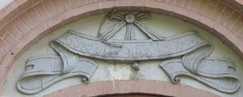 Zwieńczenie portalu z płaskorzeźbą szarfy, na której widniał zapewne napis "Wybudowano w 1886-87". Z tego niemieckiego napisu pozostała tylko data