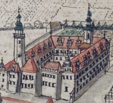 Dokładniejszy widok nieistniejącej wieży z rys. M. Meriana. Obok niej podwyższony dach skrzydła wschodniego |