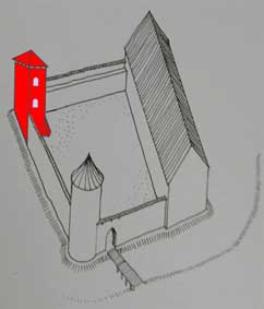 Kolorem czerwonym pokazano schematyczny widok wieży, o wymiarach poprzecznych zbliżonych do rzeczywistych. Słabo widoczna jest przypora narożna wiezy |